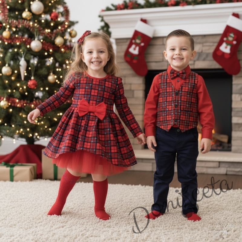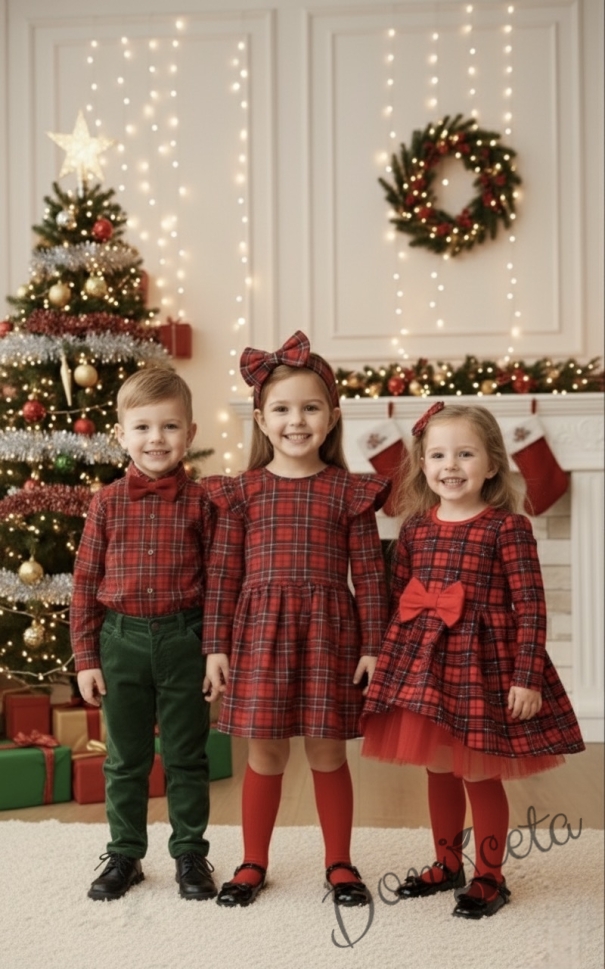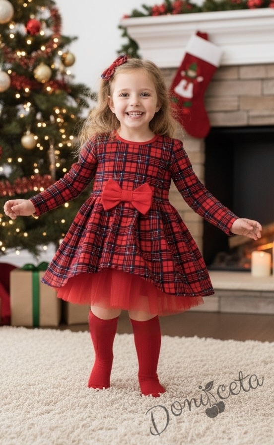 Коледна бебешка и детска рокля Надежда в каре с дълъг ръкав и тюл в червено Карена