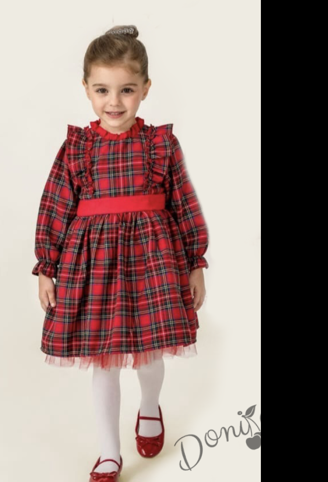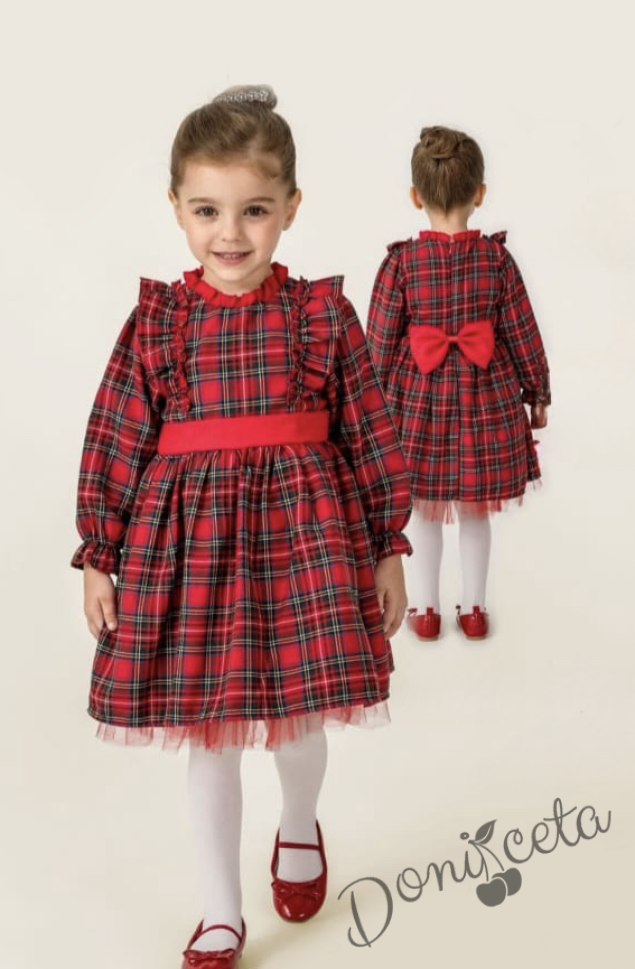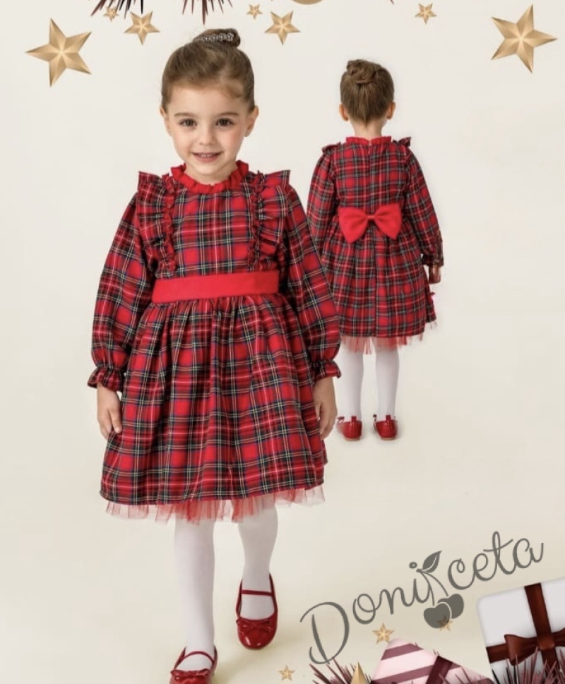 Детска коледна рокля за момиче в каре с къдрички и панделка на гърба