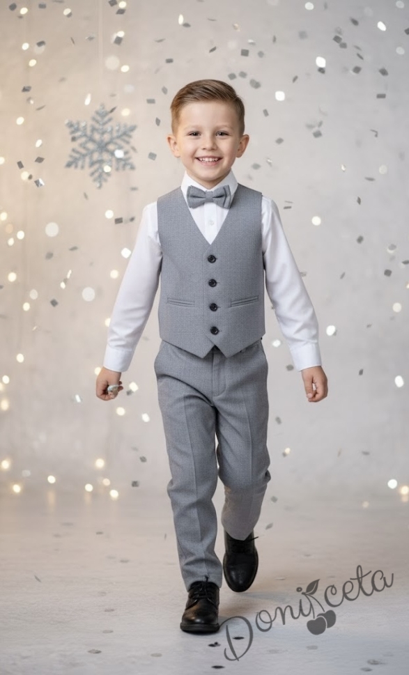 Официален костюм момче от елек в сиво, риза в бяло, панталон и папийонка