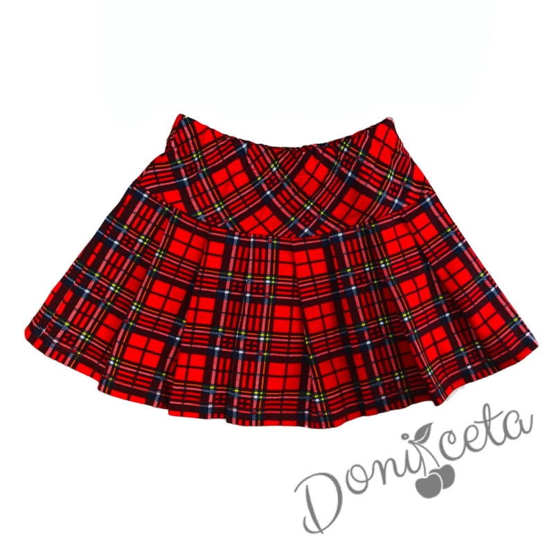 Комплект от 2 части - пола плисе каре в червено и риза с дълъг ръкав