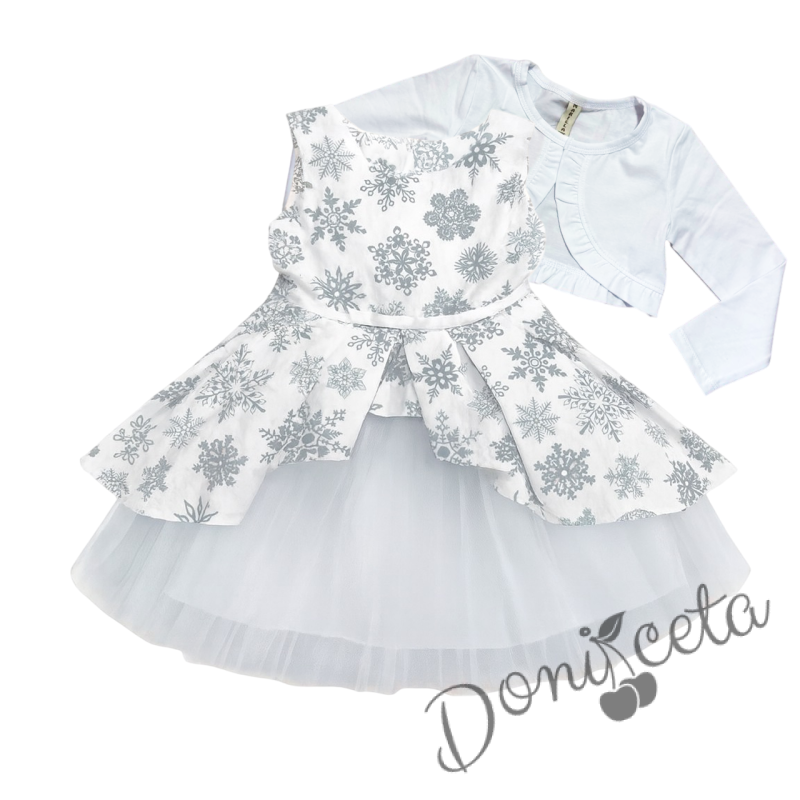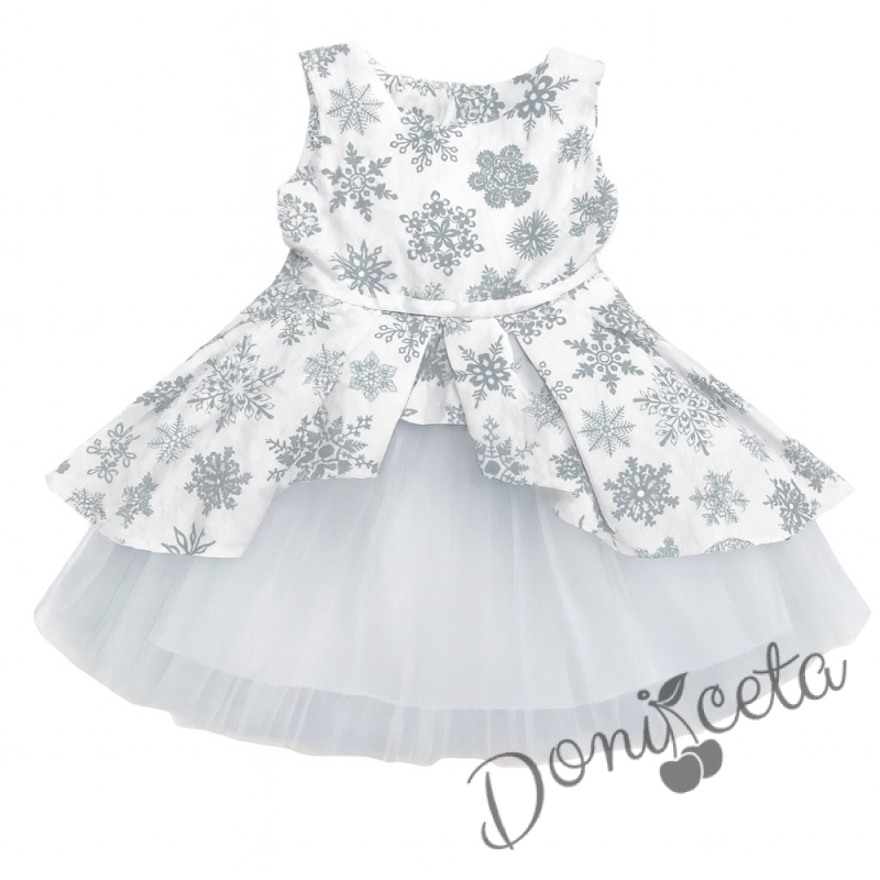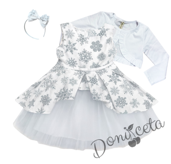 Комплект за момиче от 3 части-детска коледна рокля в бяло на сиви снежинки с тюл и коланче, памучно бяло болеро и диадема