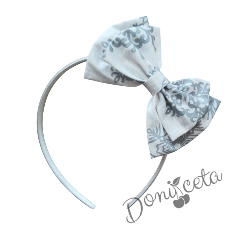 - Нежна коледна детска рокличка в бяло на сиви снежинки, памучно болеро в бяло и диадема със същите коледни мотиви като роклята