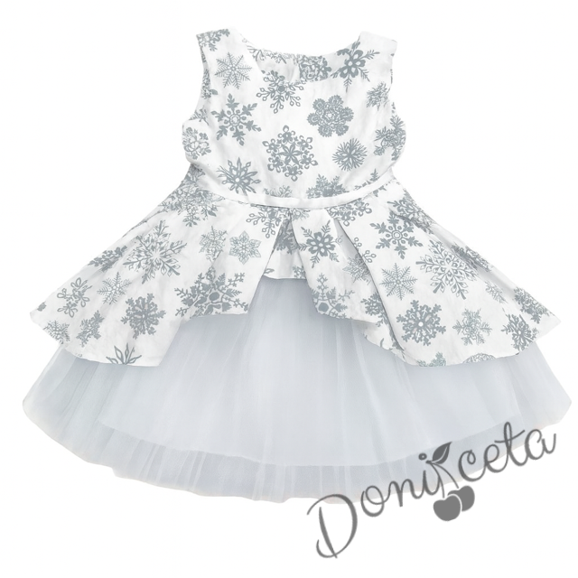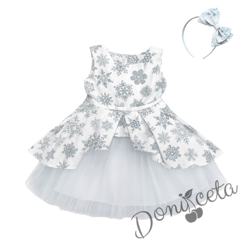 Детска коледна рокля в бяло на сиви снежинки с тюл в бяло и коланче в бяло и коледна диадема с панделка