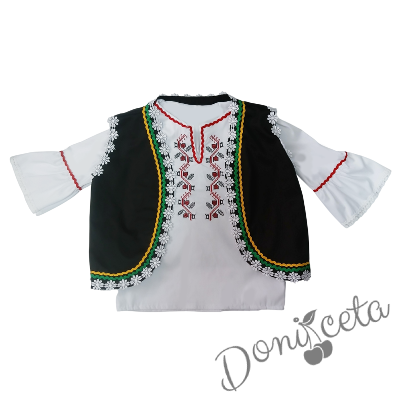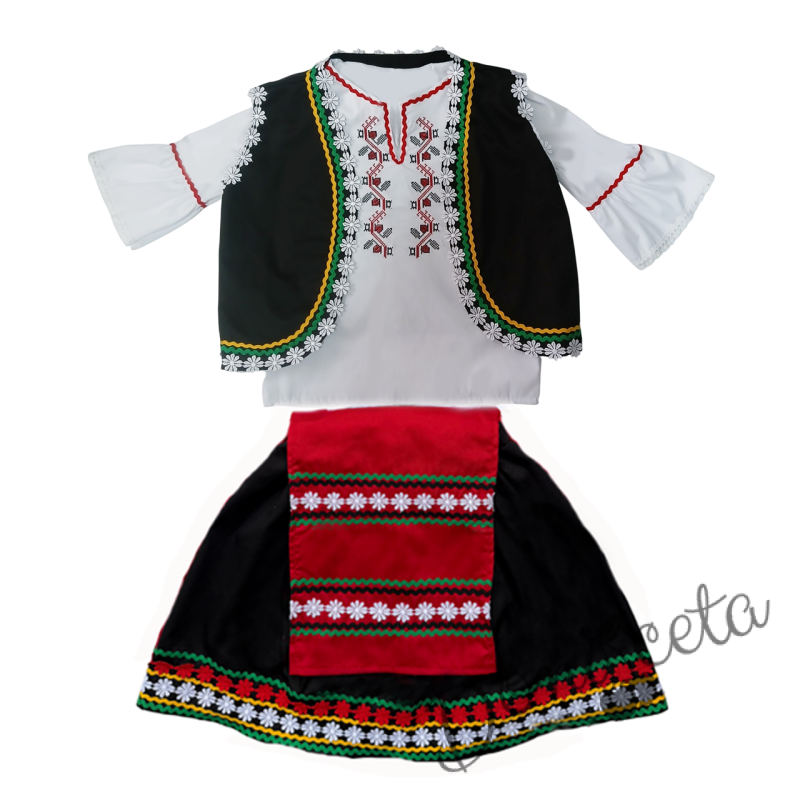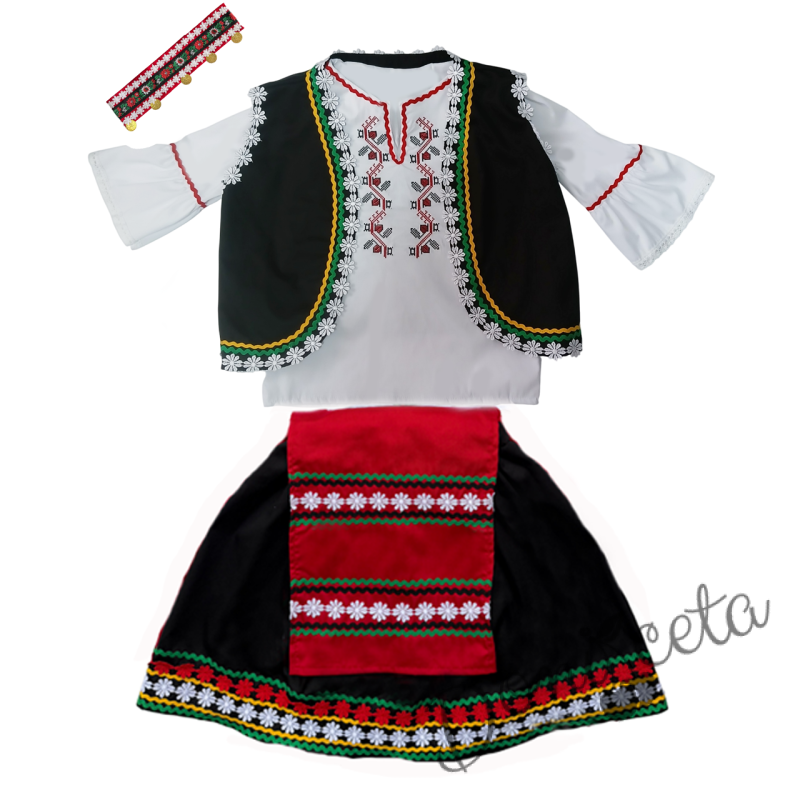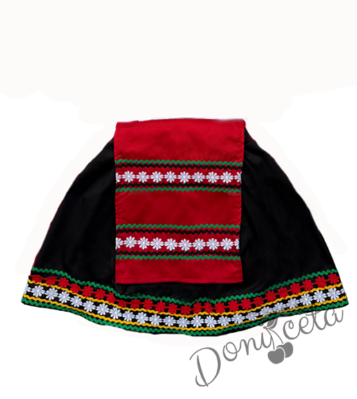 Красив памучен фолклорен комплект за момиче от пола в черно, риза в бяло, престилка в червено и елек в червено с етно мотиви.