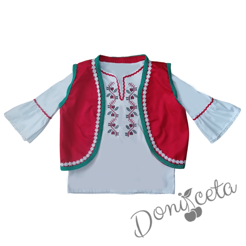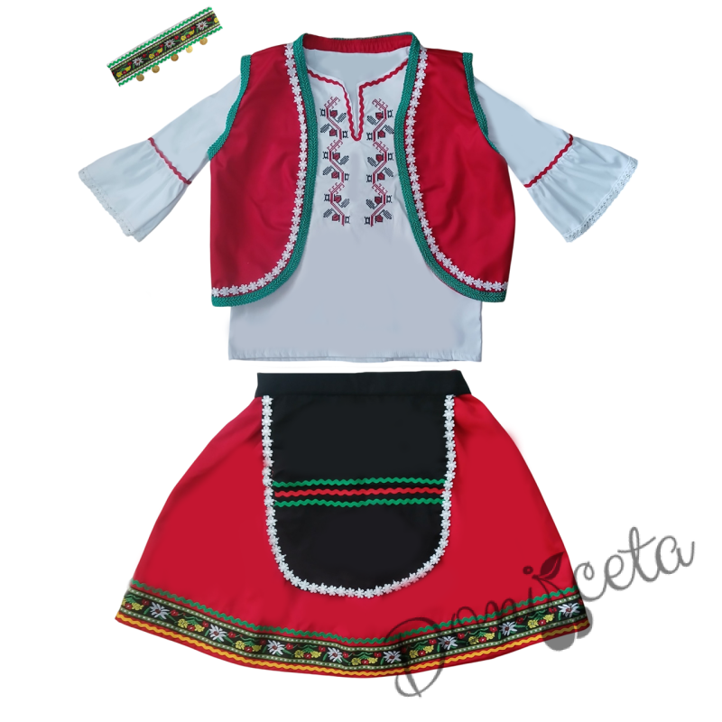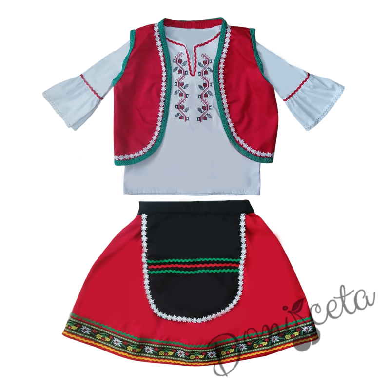 Красив памучен фолклорен комплект за момиче от пола в червено, риза в бяло, престилка в черно и елек в червено с етно мотиви.