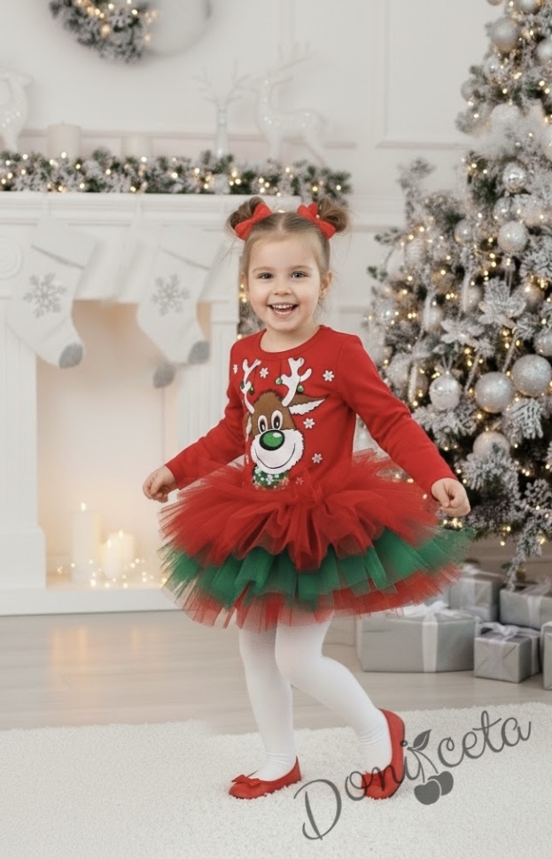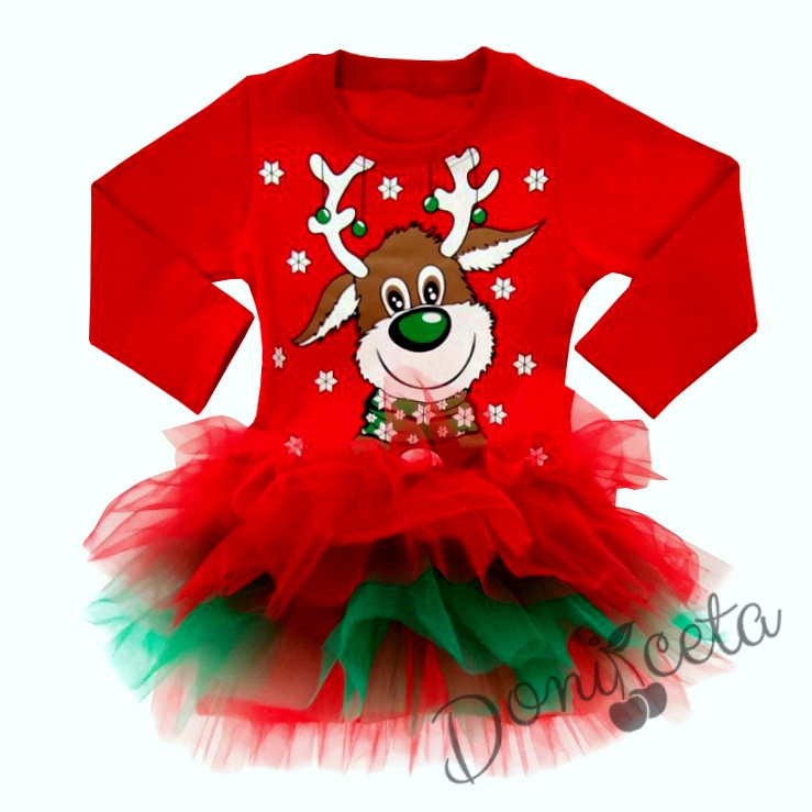 Ватирана коледна детска рокля Звън в червено и зелено с тюл с еленче отпред