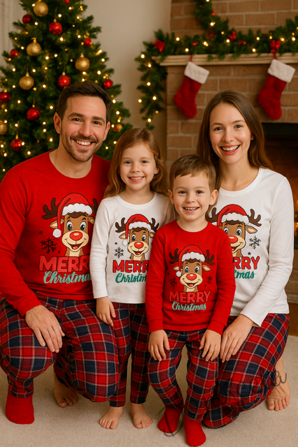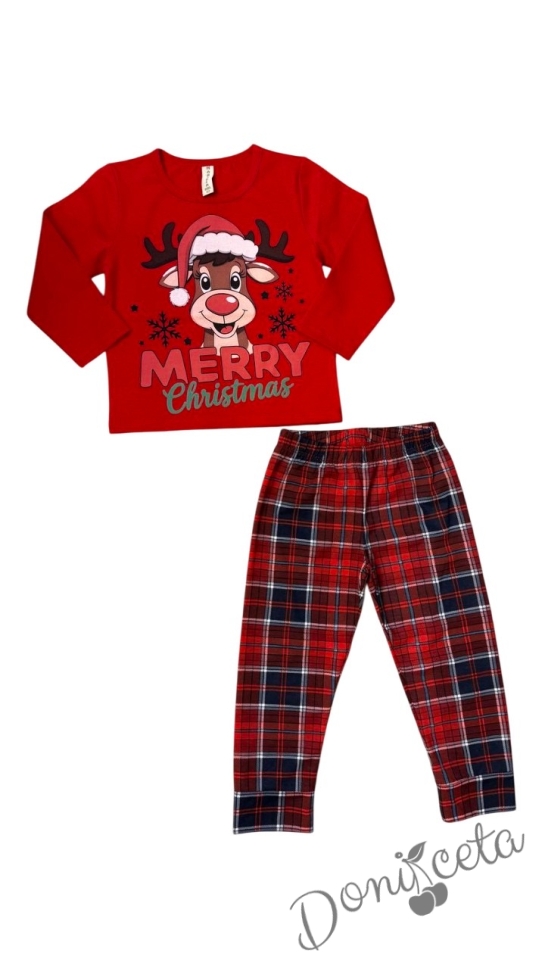 Детска, дамска или мъжка коледна пижама в червено и каре с весело еленче и надпис Весела Коледа