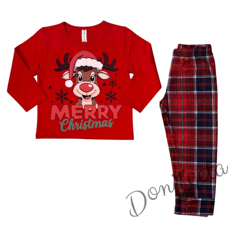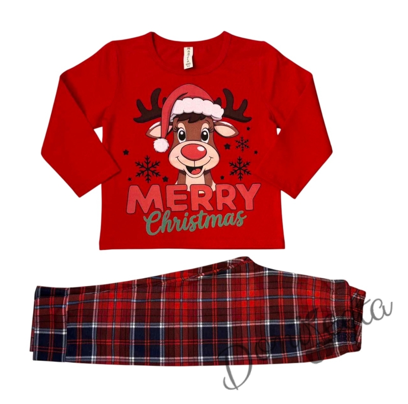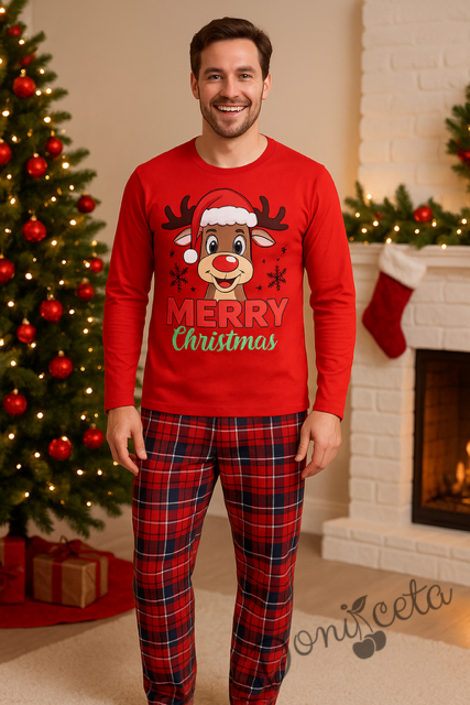 Мъжка коледна пижама в червено с весело еленче и надпис Весела Коледа