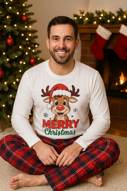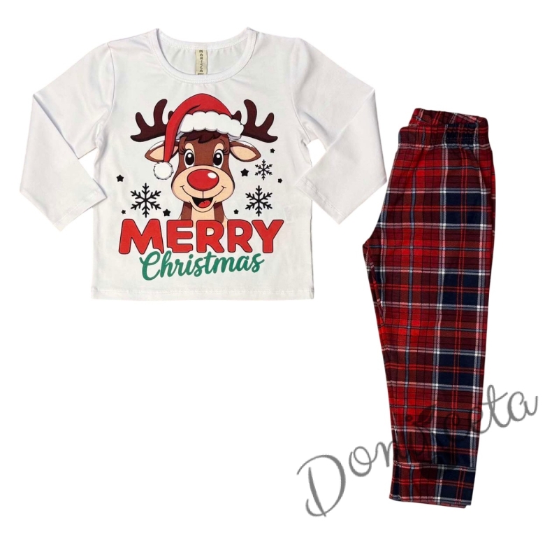 Мъжка коледна пижама в бяло и каре с весело еленче и надпис Весела Коледа