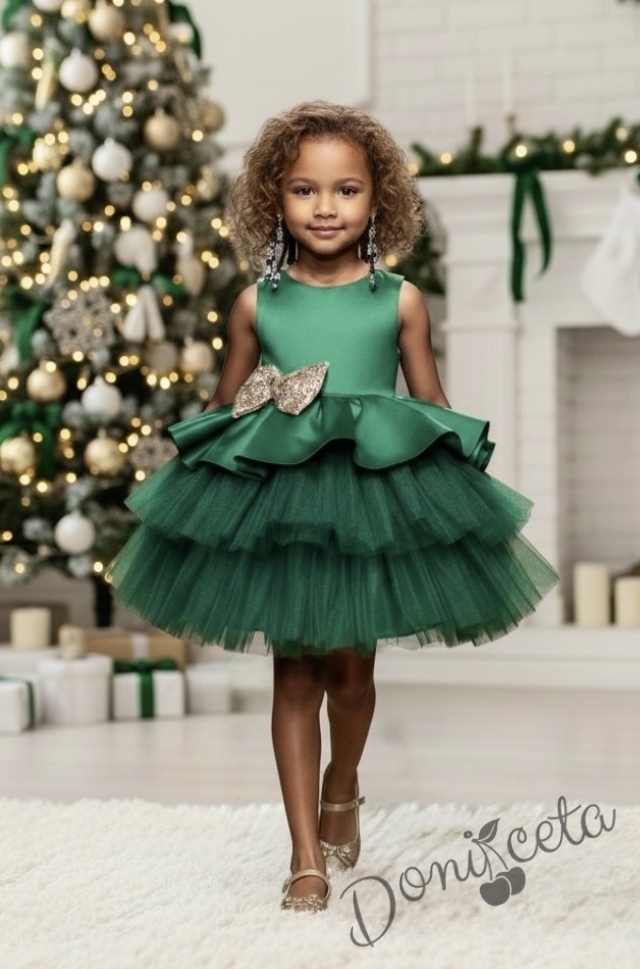 Коледна детска рокля в зелено с тюл и панделка в златисто