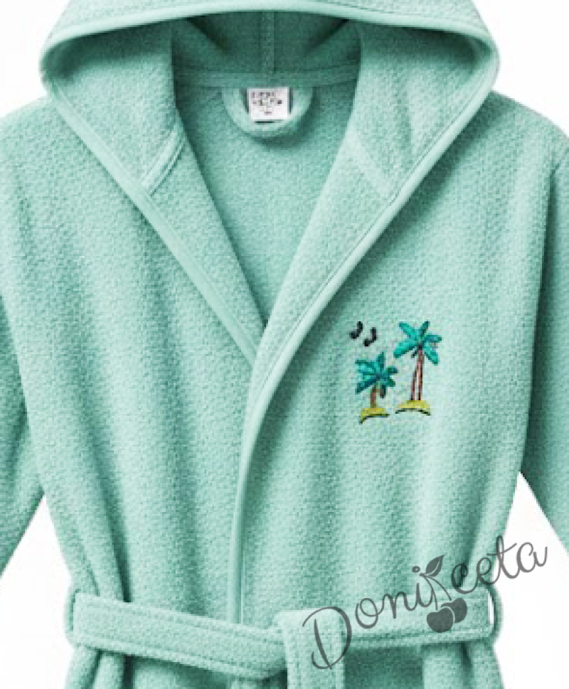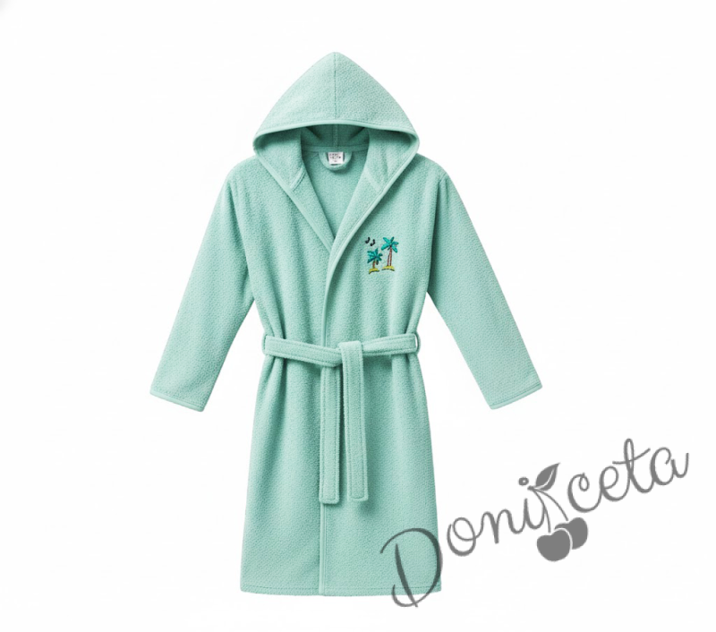 Детски халат за баня в цвят мента с качулка, джобчета и картинка