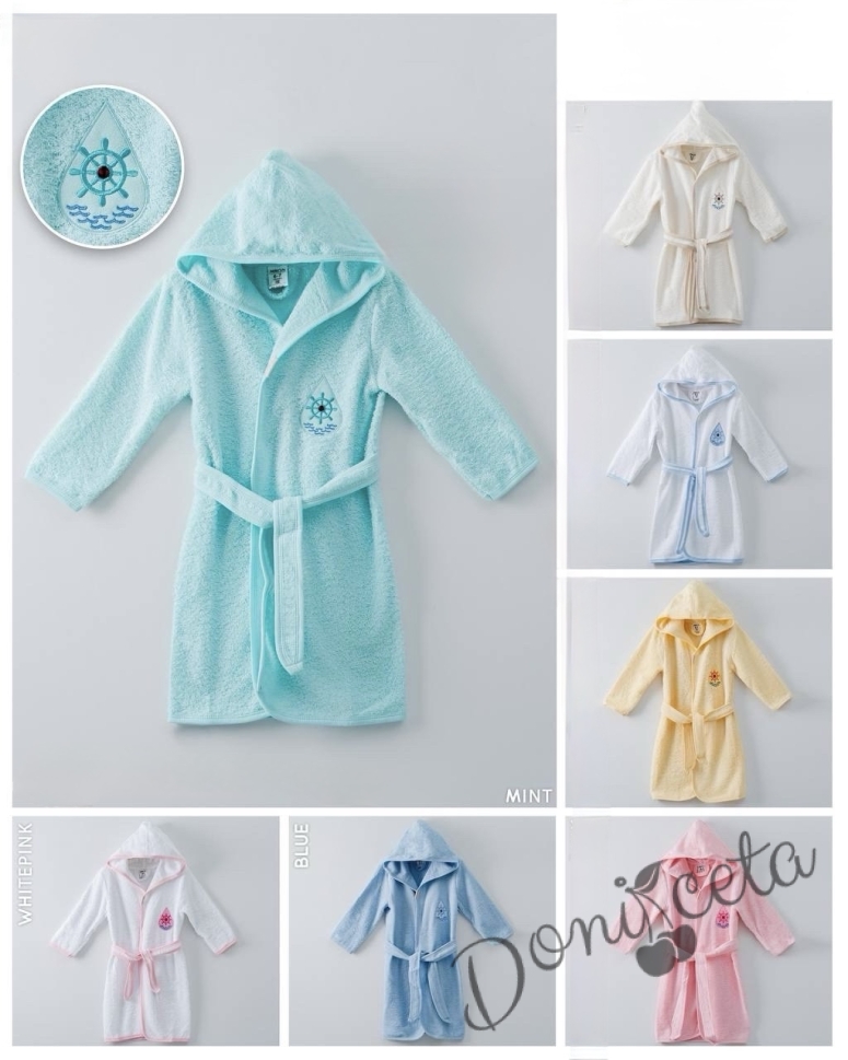 Детски халат за баня с качулка, джобчета и картинка в цвят мента
