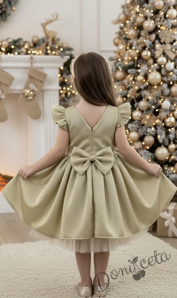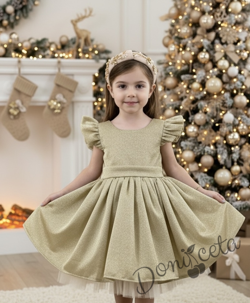 Официална детска рокля с къс ръкав с брокат в златисто с тюл с панделка и фиба с панделка Балеа