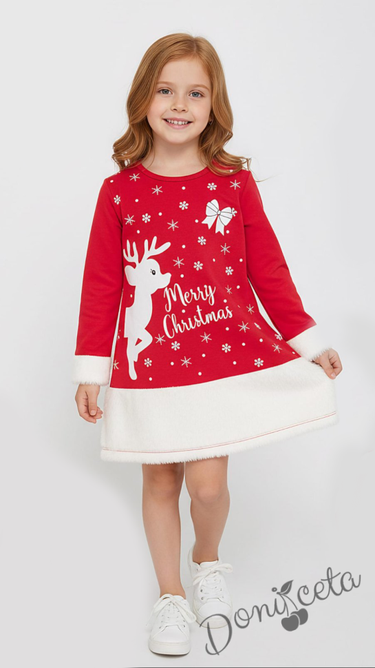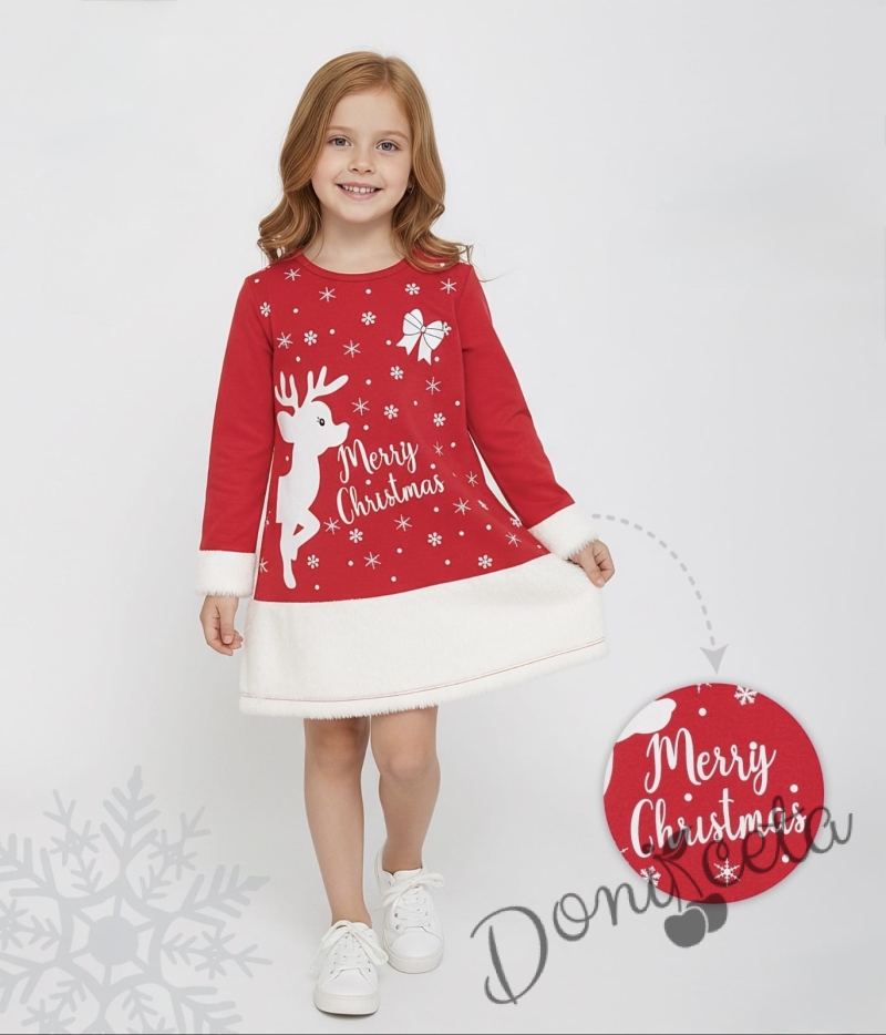 - Много сладка Коледна детска рокля в червено с плюшени яка и маншети и сладки коледни мотиви.