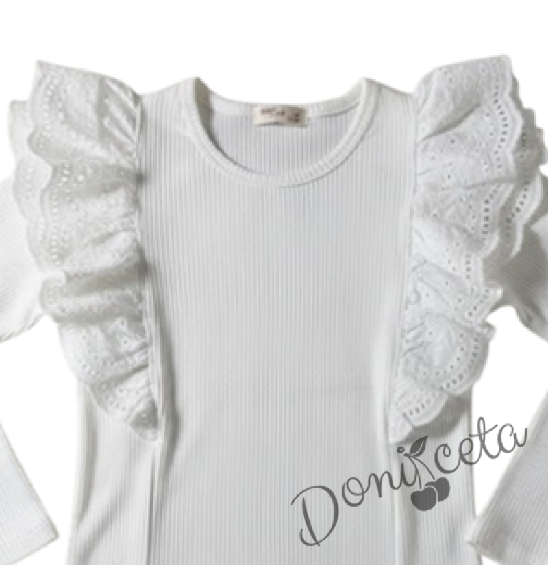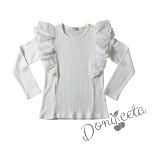 Детска рипсана блуза с дълъг ръкав в бяло с ефектни къдрици