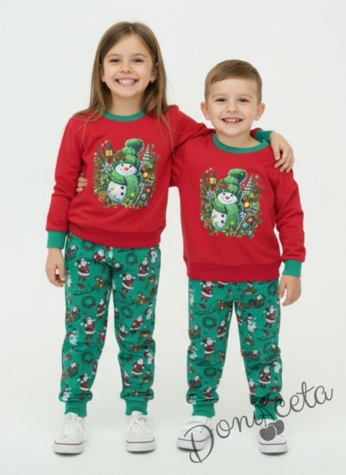 Ватиран коледен детски комплект в червено и зелено със снежен човек