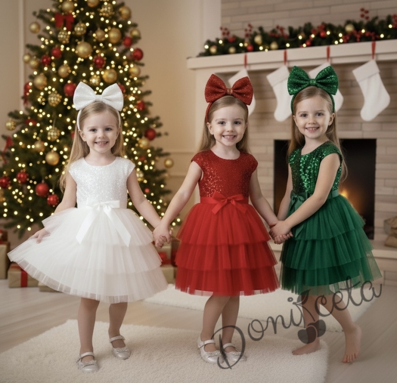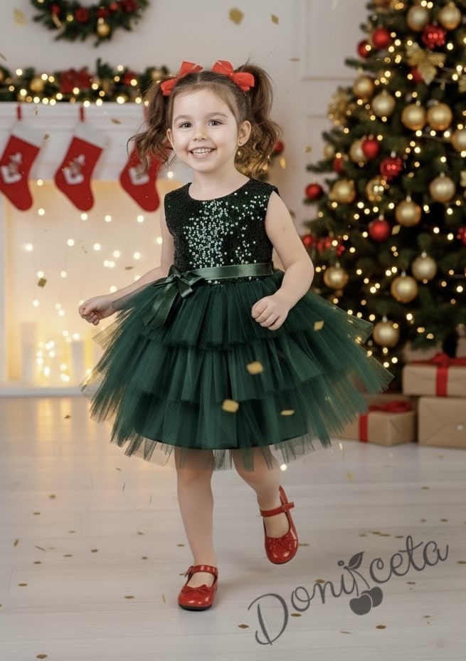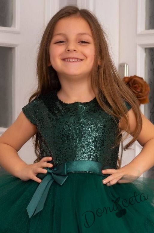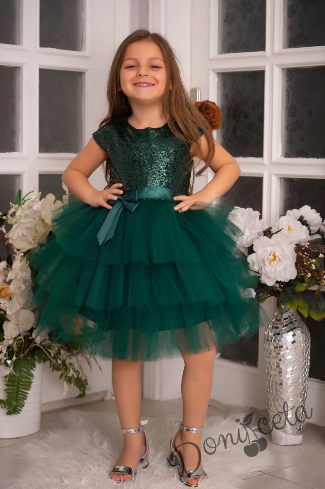 Детска официална рокля Хава в зелено от пайети и тюл на пластове
