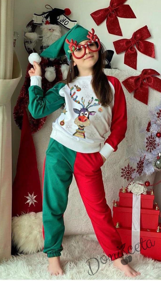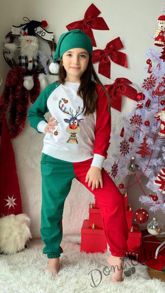 Коледен комплект за момиче от блуза в бяло с елен,панталонки в червено и зелено и коледна шапка в зелено