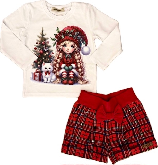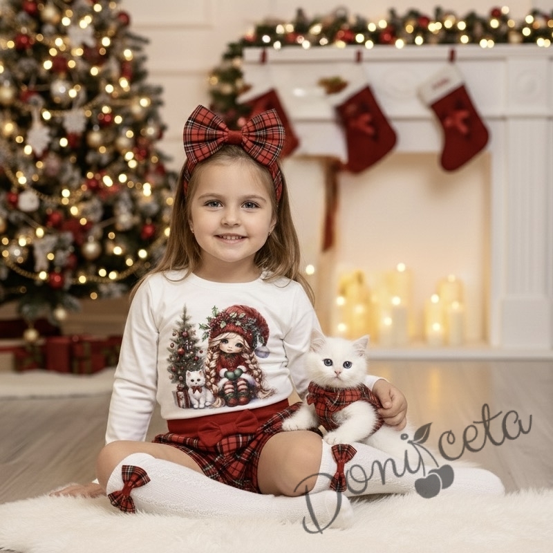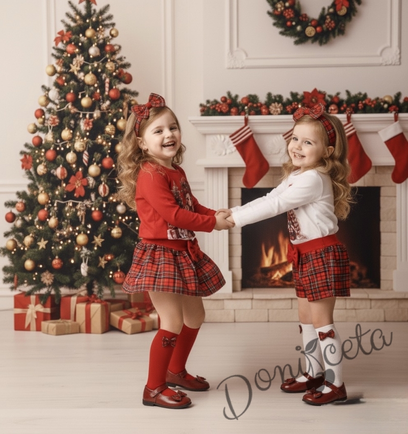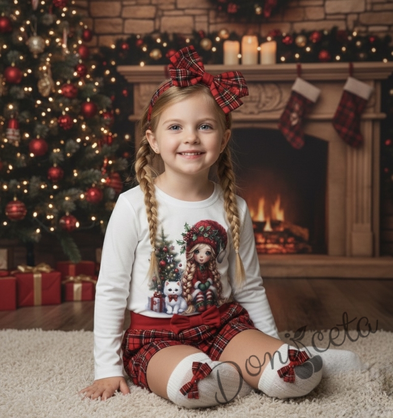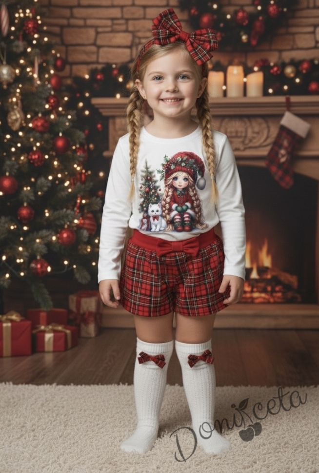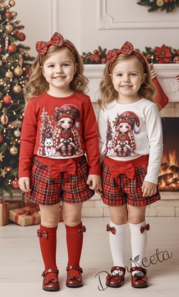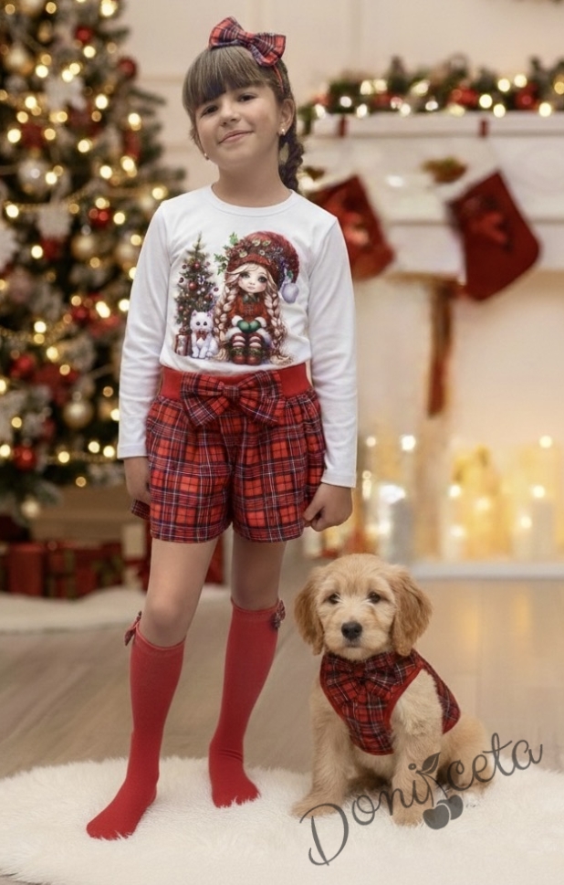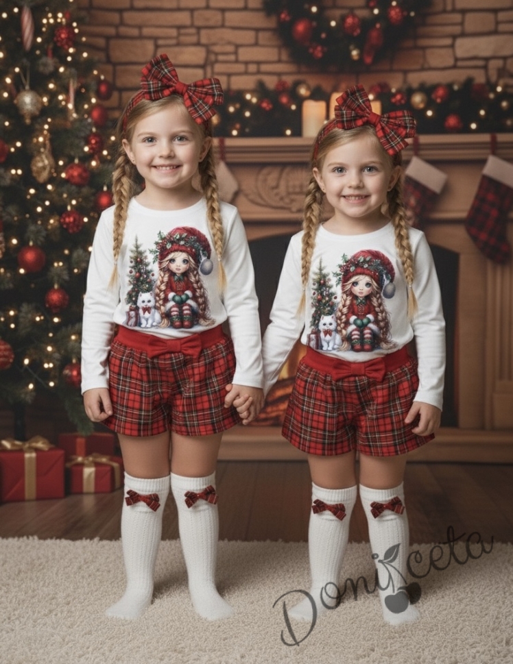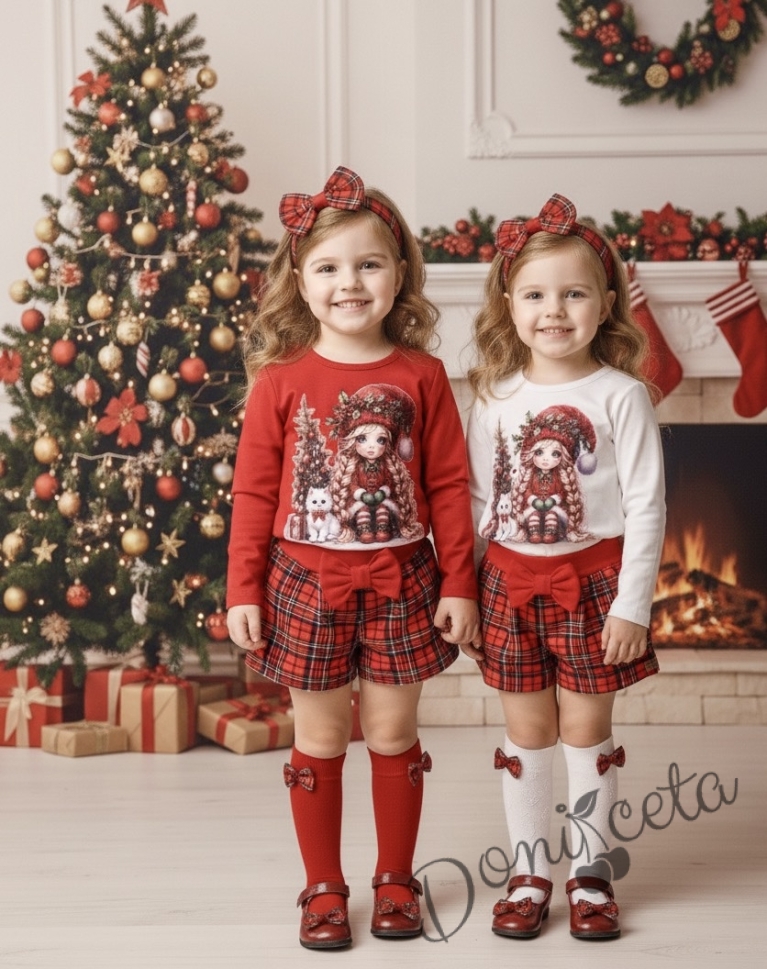 - Модерен комплект за момиче от къси карирани панталонки в червено и блуза с дълъг ръкав в бяло с коледна картинка на момиченце и елха.