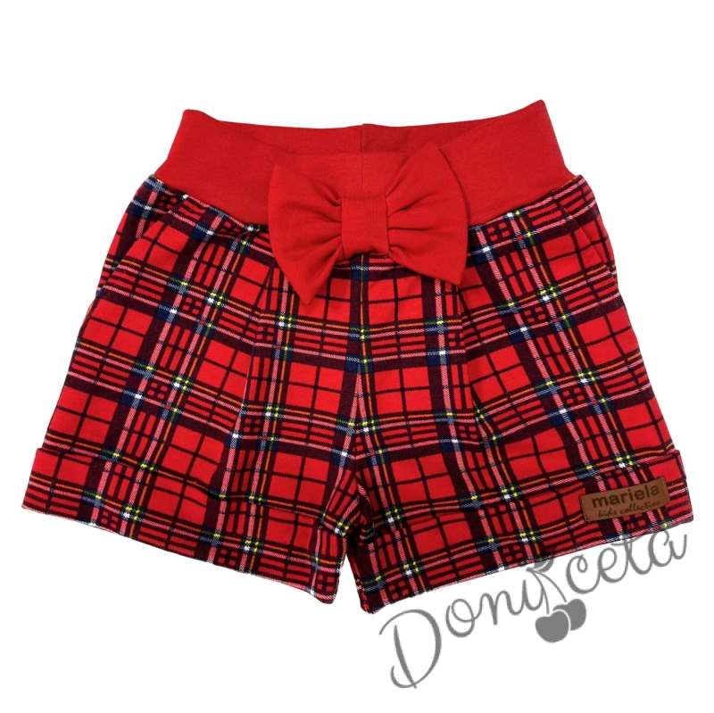 Детски комплект от къси панталони в червено каре и блуза в бяло с момиченце и елха
