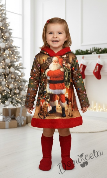 Коледна детска рокля в червено с дядо Коледа с качулка и червен пухкав завършек