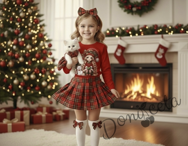 Детски комплект за момиче от пола каре и блуза в червено с коледна картинка на момиченце и елха Карена