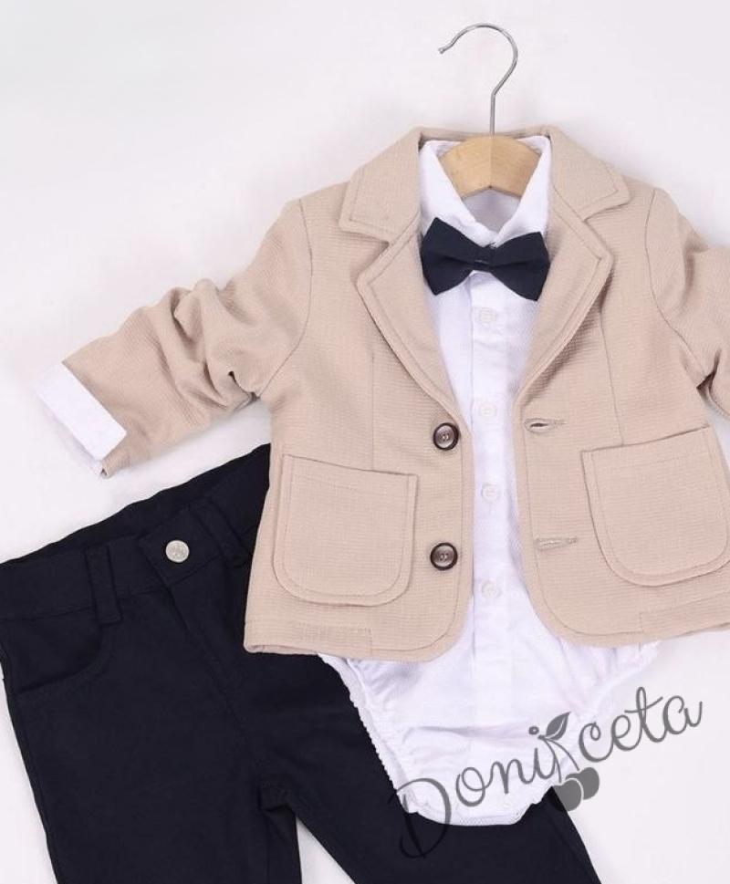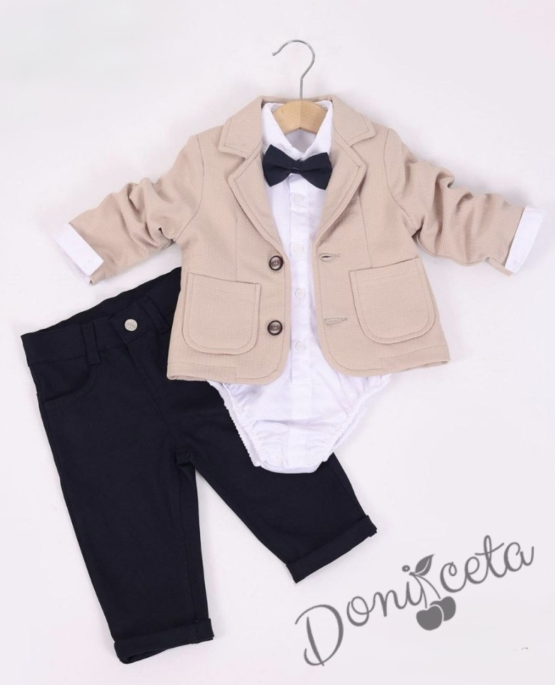 Бебешки комплект за момче от 4 части - боди-риза в бяло с панталон, сако и папийонка в бежово и тъмен панталон