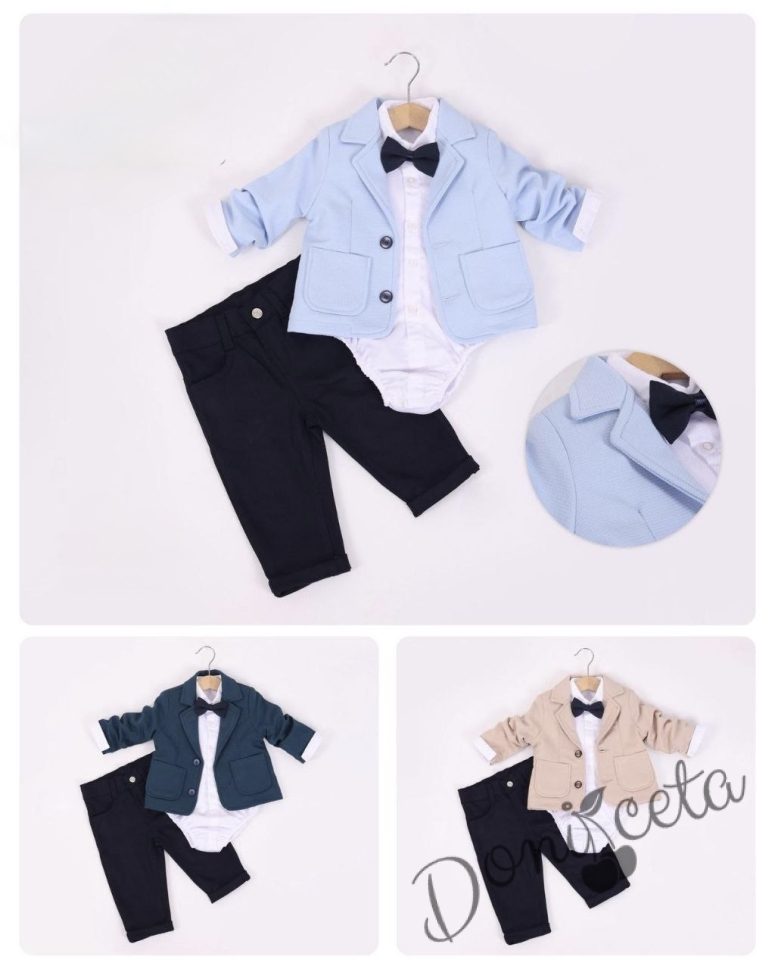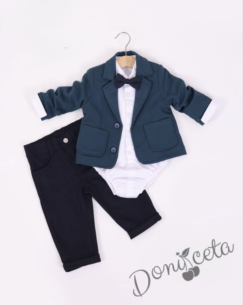 Бебешки комплект за момче от 4 части- боди-риза в бяло с панталон, сако и папийонка в тъмносиньо и тъмен панталон