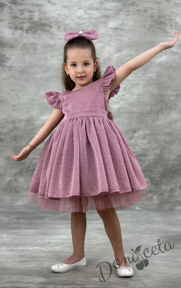 Начало МОМИЧЕТА Официална детска рокля с къс ръкав с брокат в пепел от рози с тюл с панделка и фиба с панделка Алина