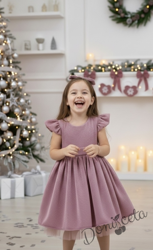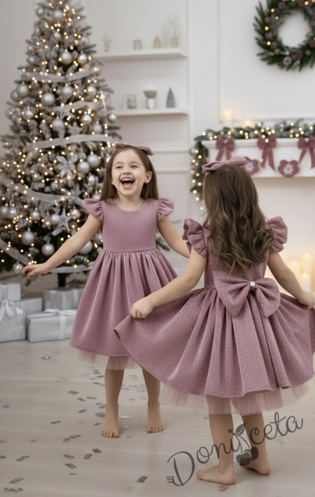 Впечатляваща детска рокля, създадена за специални поводи! Изработена от висококачествена блестяща материя в елегантен цвят пепел от рози, тя придава изискан и празничен вид. Горната част е с красиво оформени къси ръкавки тип "крилца", а полата е богато разкроена с тюл отдолу за допълнителен обем и приказен ефект.