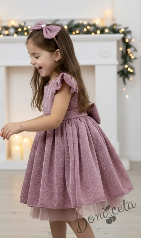 Официална детска рокля с къс ръкав с брокат в пепел от рози с тюл с панделка и фиба с панделка Балеа