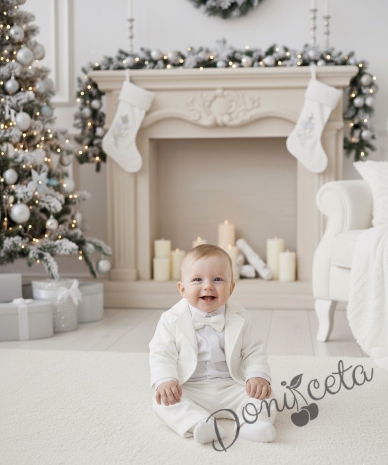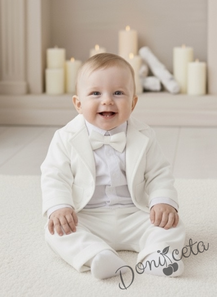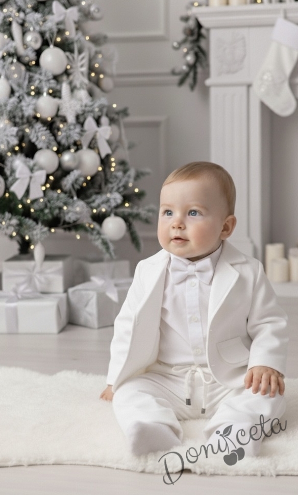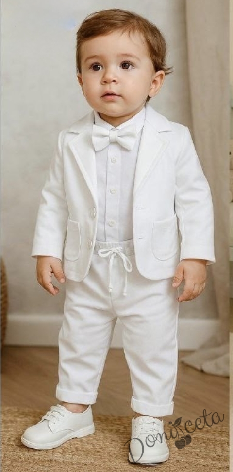 Официален бебешки костюм за момче от 4 части - сако в бяло, риза в бяло, панталон и папийонка в бяло