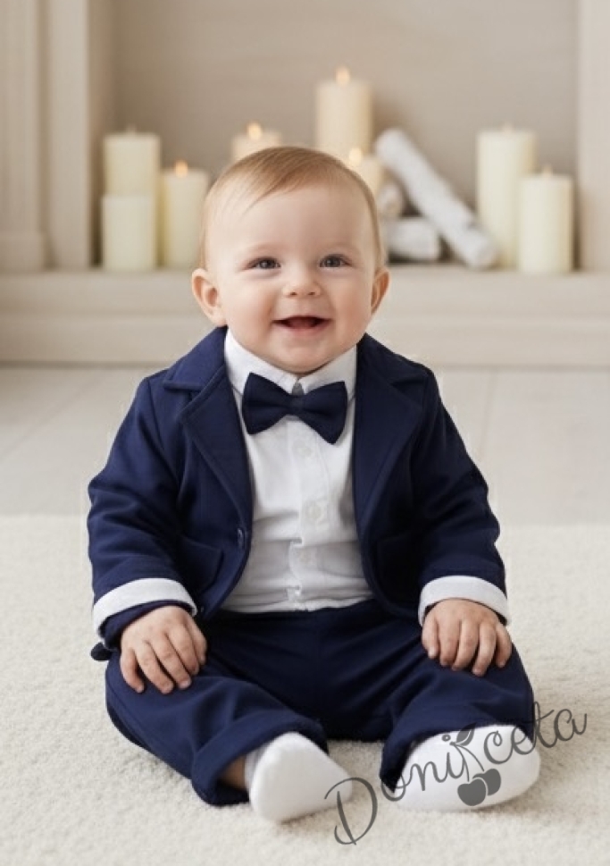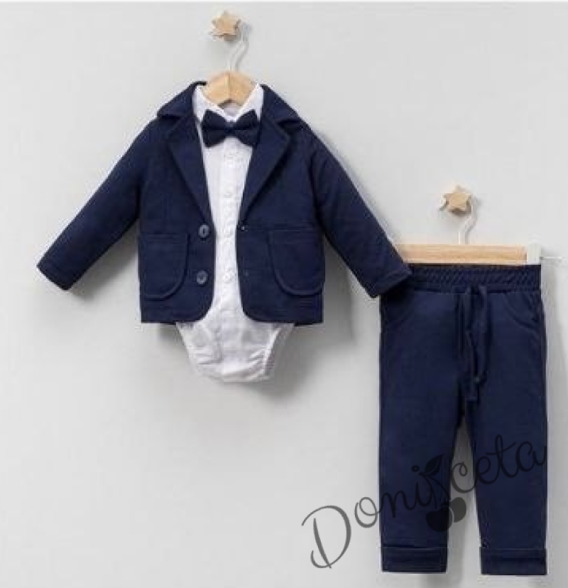 Бебешки комплект за момче от 4 части- боди-риза в бяло с панталон, сако и папийонка в тъмносиньо