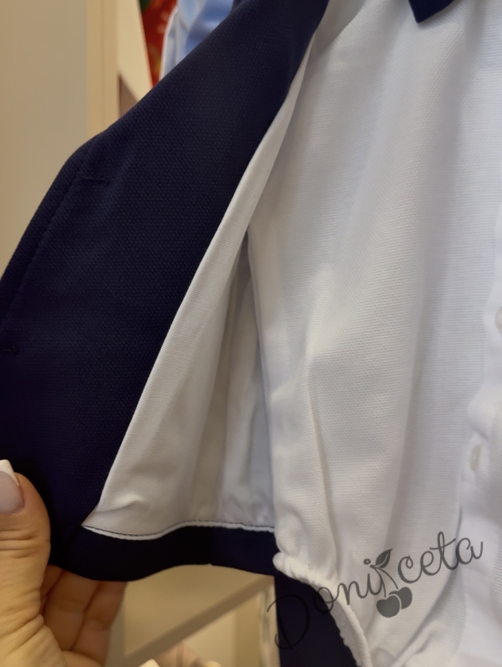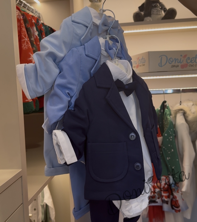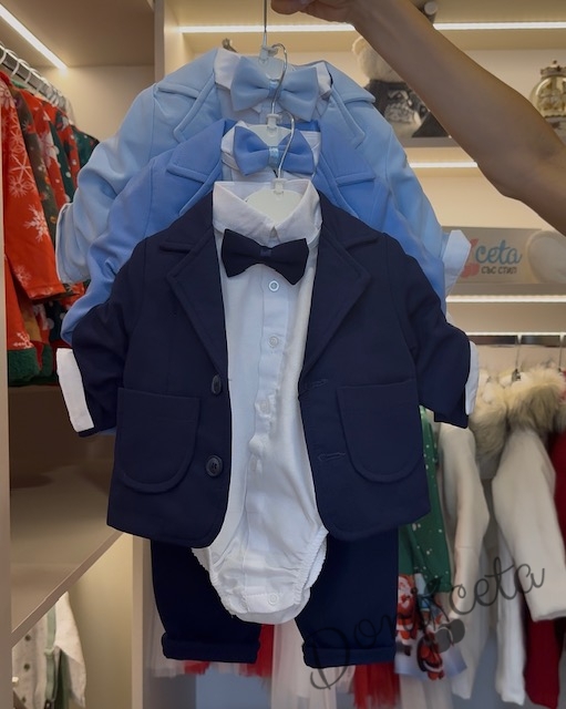 - Стилен комплект за момче от 4 части - боди-риза в бяло с панталон, сако и папийонка в тъмносиньо.
