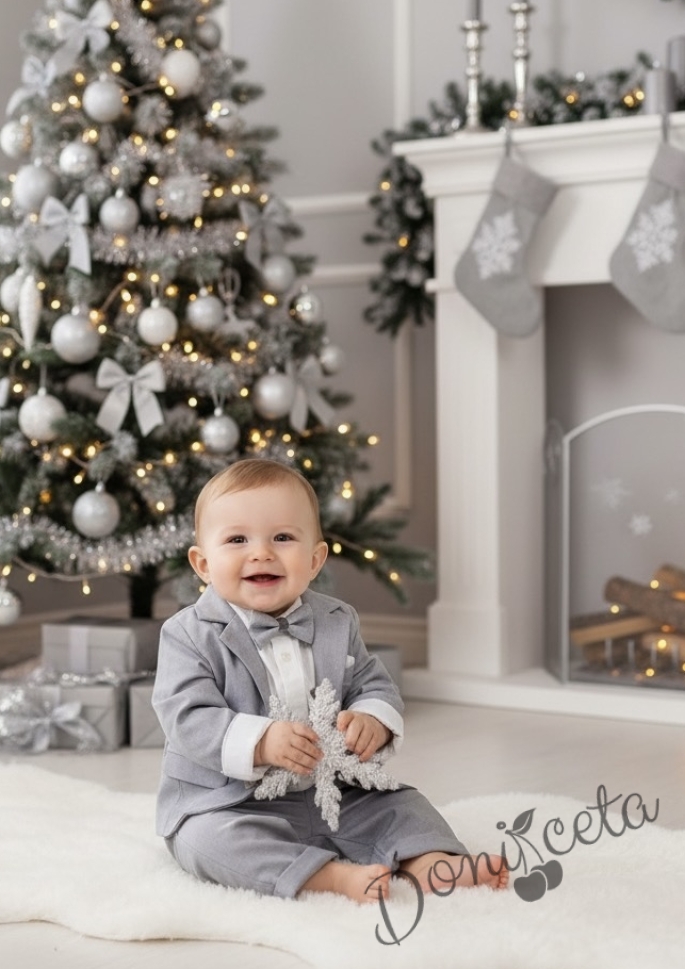 Начало БЕБЕ МОМЧЕ Бебешки елегантен костюм за момче от 4 части в сиво - сако, панталон, риза в бяло и папийонка