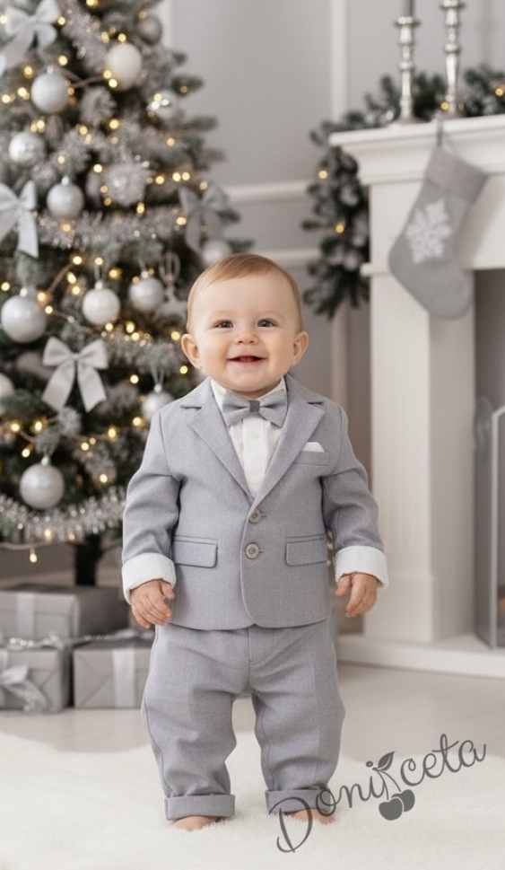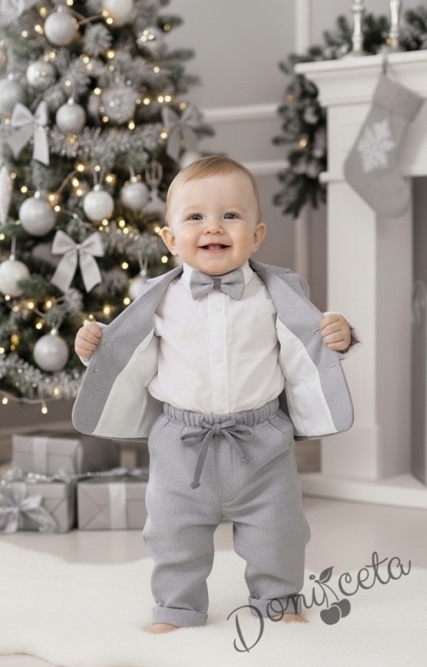 Бебешки елегантен костюм за момче от 4 части в сиво - сако, панталон, риза в бяло и папийонка
