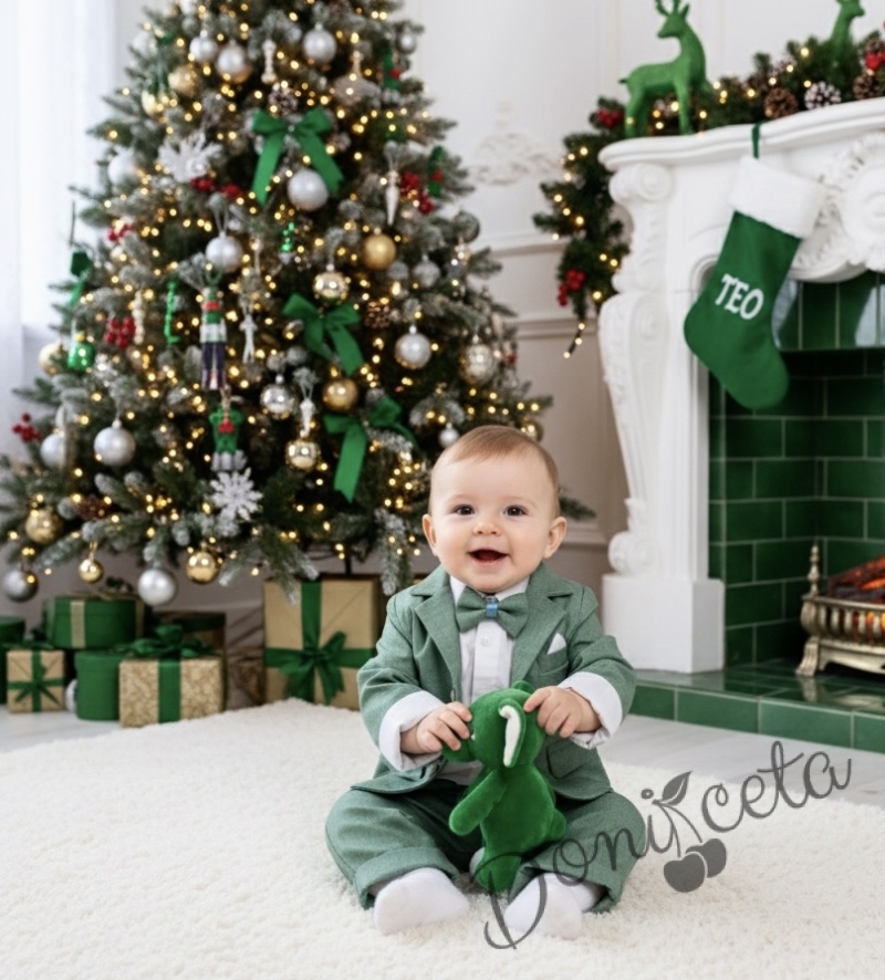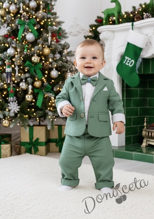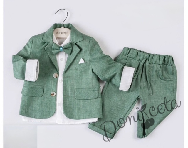 Бебешки елегантен костюм за момче от 4 части в зелено - сако, панталон, риза в бяло и папийонка