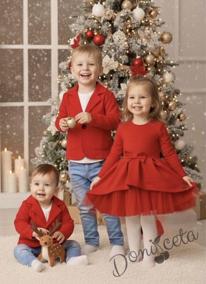 Детска коледна рокля с дълъг ръкав Надежда в червено с тюл отпред