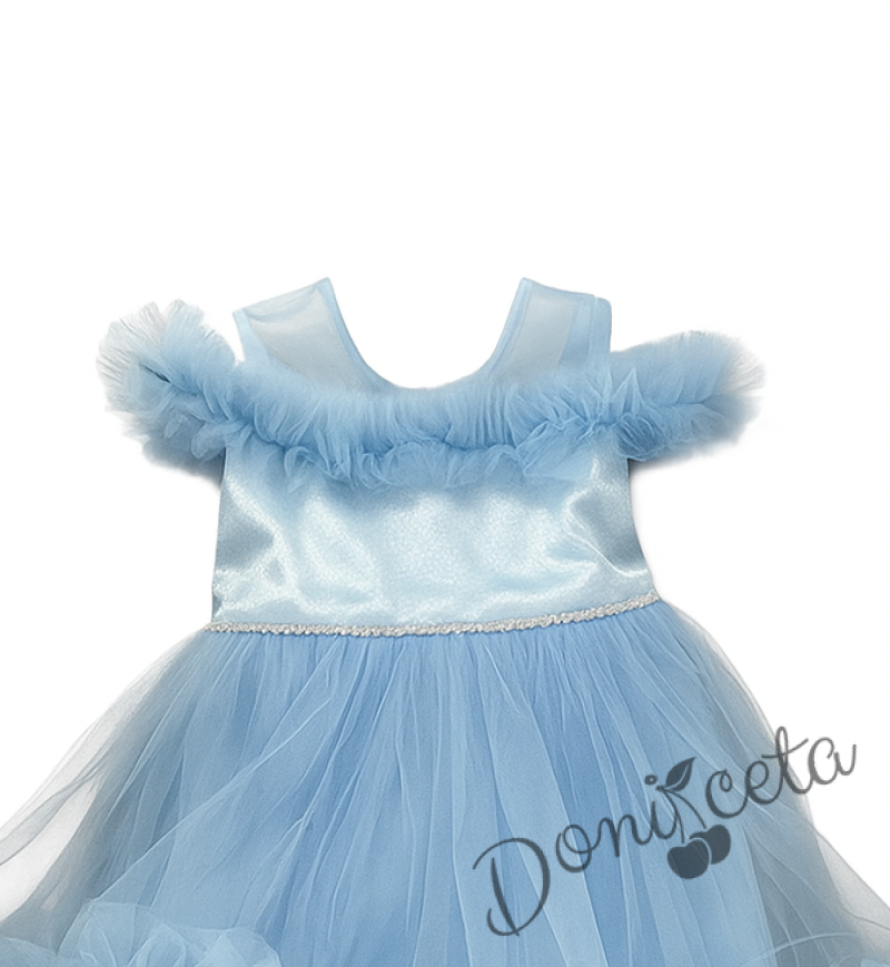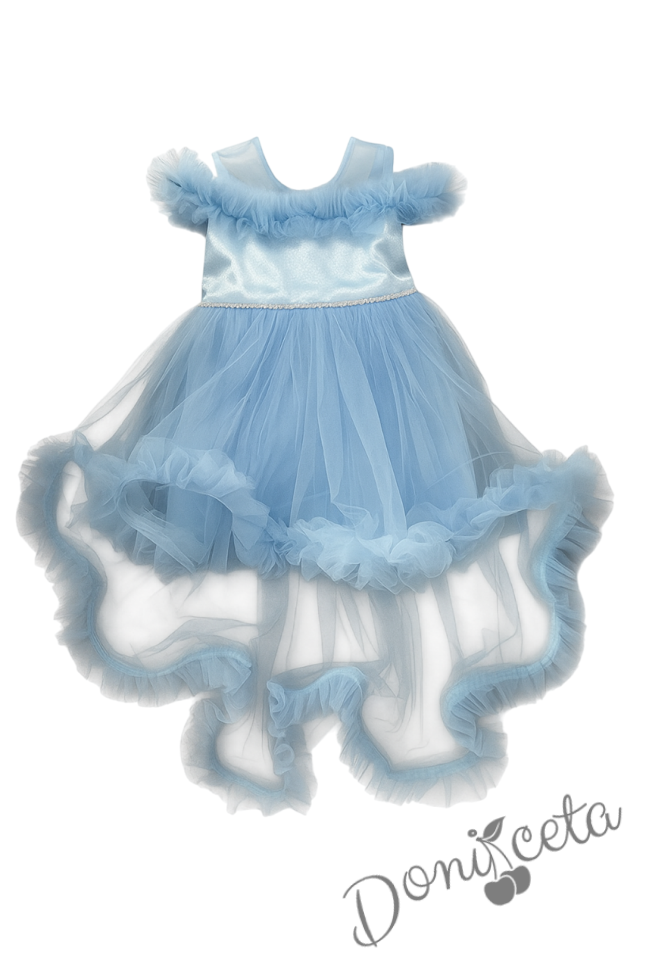 • Официална детска къса рокля с шлейф с богат тюл в светлосин цвят.
