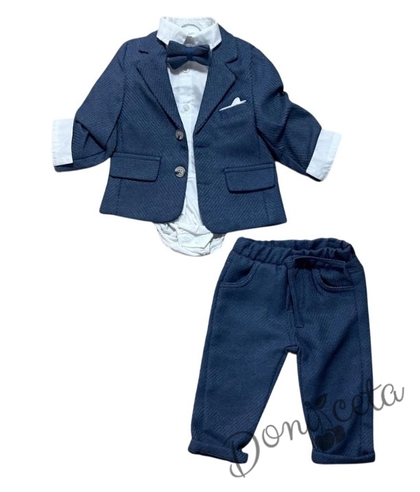Бебешки комплект за момче от 4 части- боди-риза в бяло с панталон, сако и папийонка в синьо
