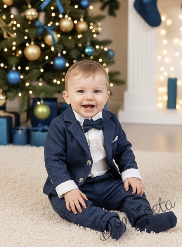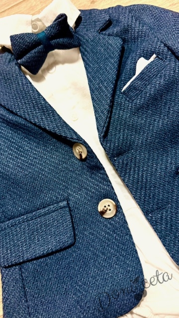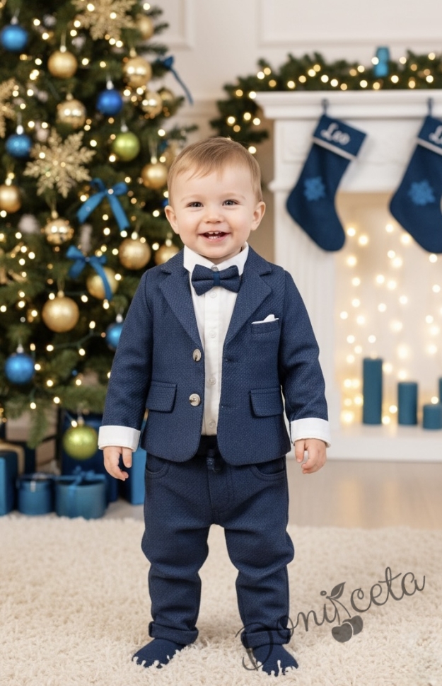 - Стилен комплект за момче от 4 части - боди-риза в бяло с панталон, сако и папийонка в тъмносиньо.