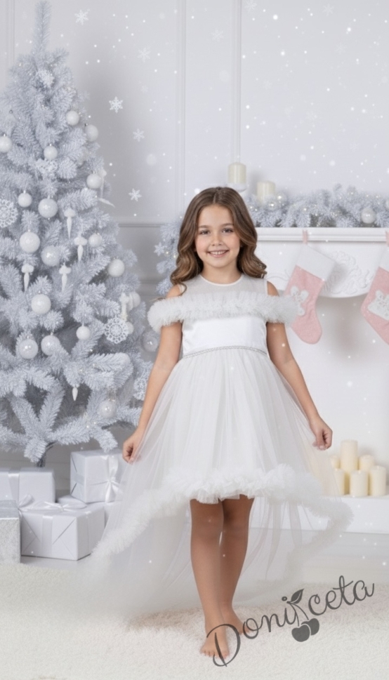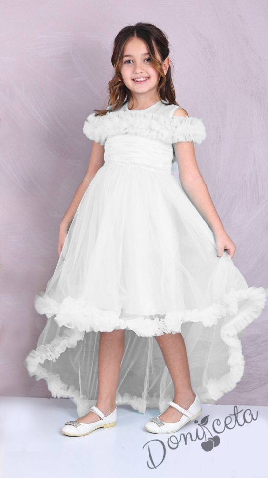 - Официална детска къса рокля с шлейф с богат тюл в бял цвят.