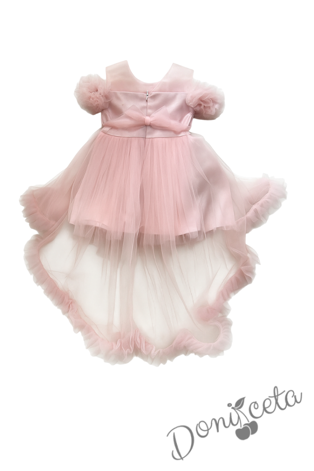 • Официална детска къса рокля с шлейф с богат тюл в цвят пудра.
