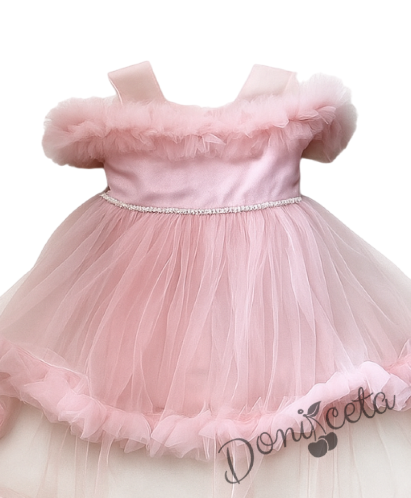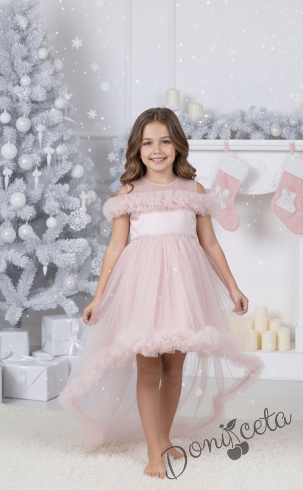 Начало МОМИЧЕТА Официална детска рокля с шлейф с тюл в цвят пудра Ария