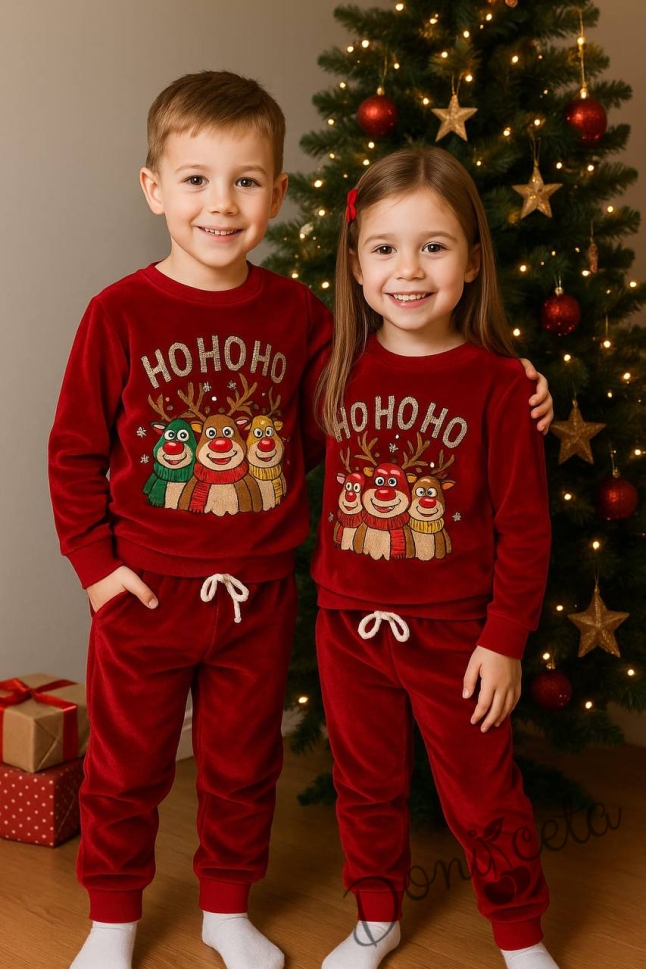 Детски коледен комплект за момче/момиче от плюшена блуза с коледни мотиви и надпис и плюшени панталонки в червено