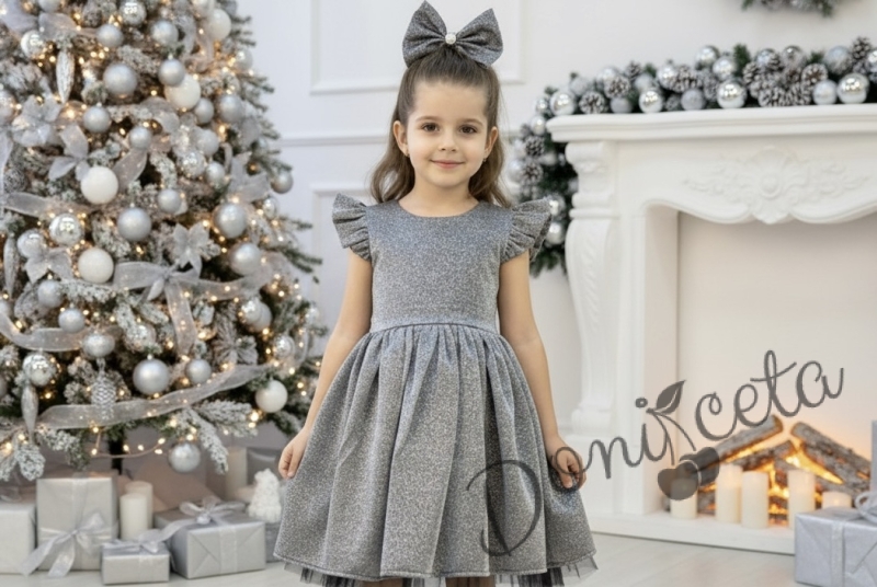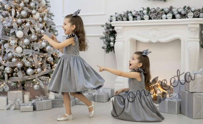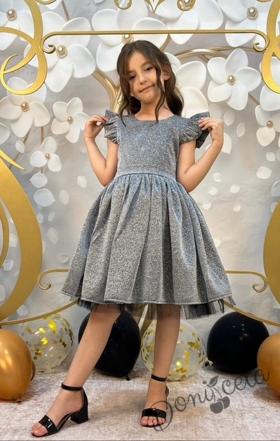 - Изключително красива рокличка изцяло в брокат с къс ръкав в сребристо.
