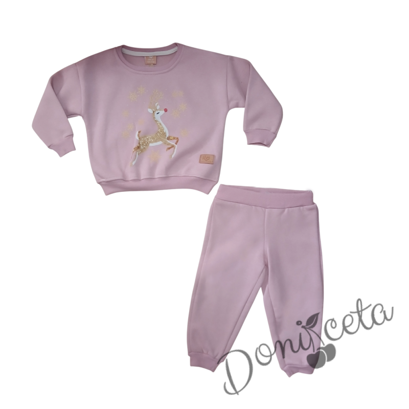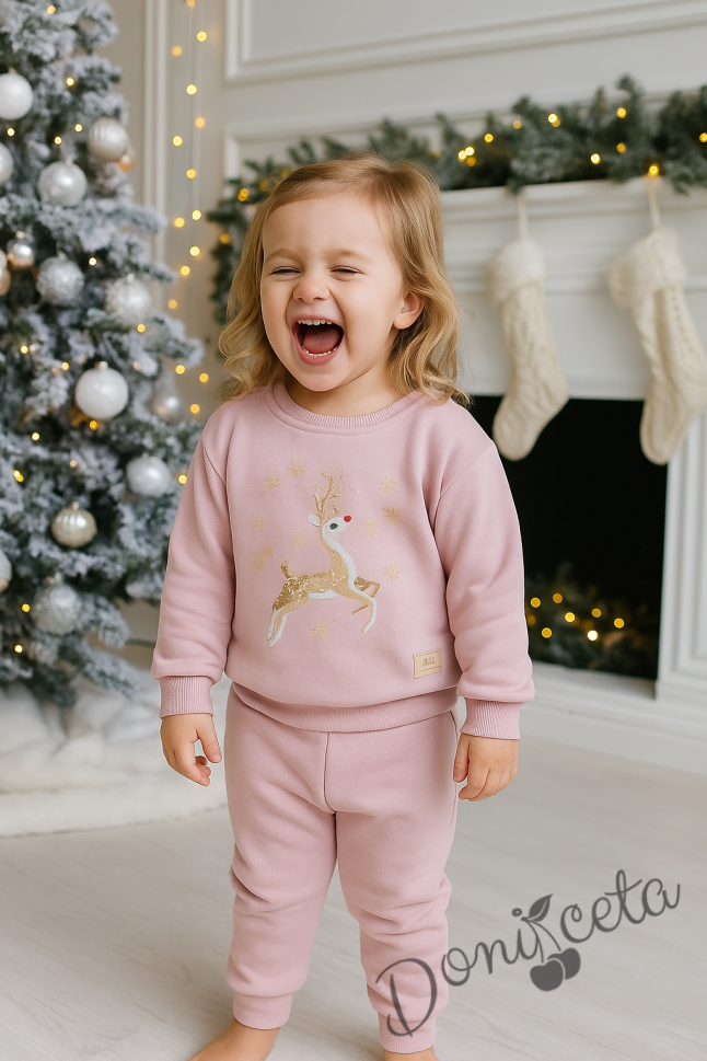 Детски коледен комплект за момиче от ватирана блуза със сладко еленче и панталонки в пепел от рози