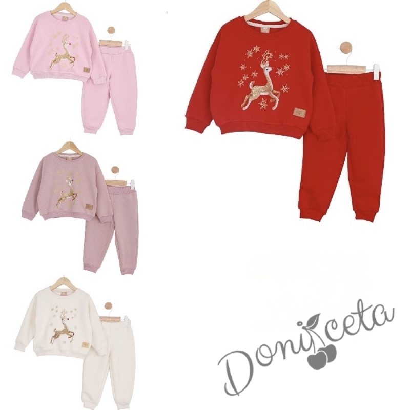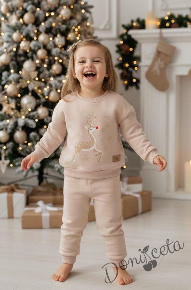 Детски коледен комплект за момиче от ватирана блуза със сладко еленче и панталонки в бежово