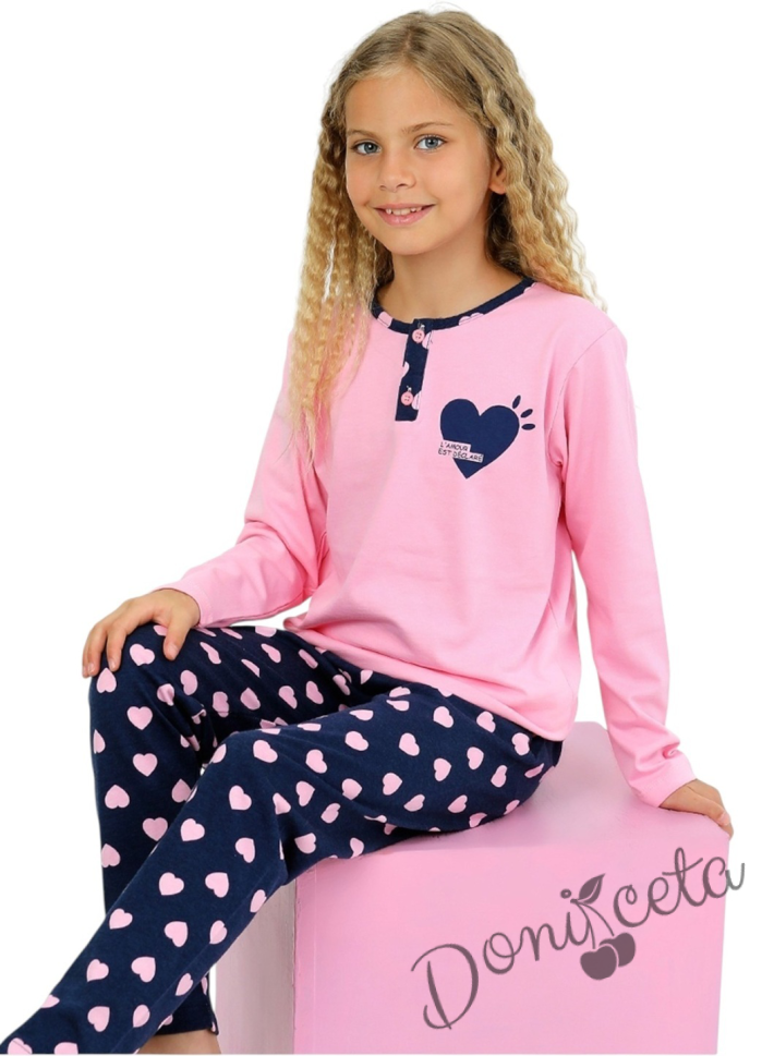 Детска пижама за момиче с горнище в розово със сърце и долнище в тъмносиньо на сърца