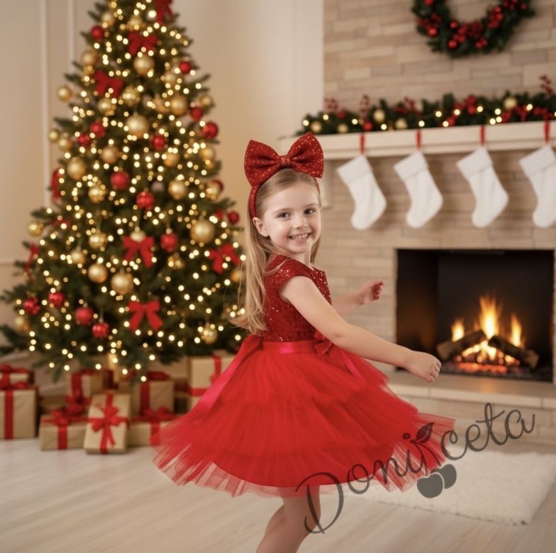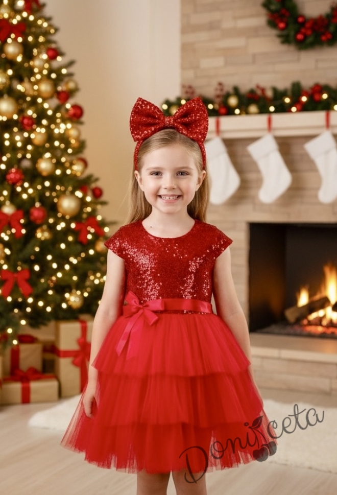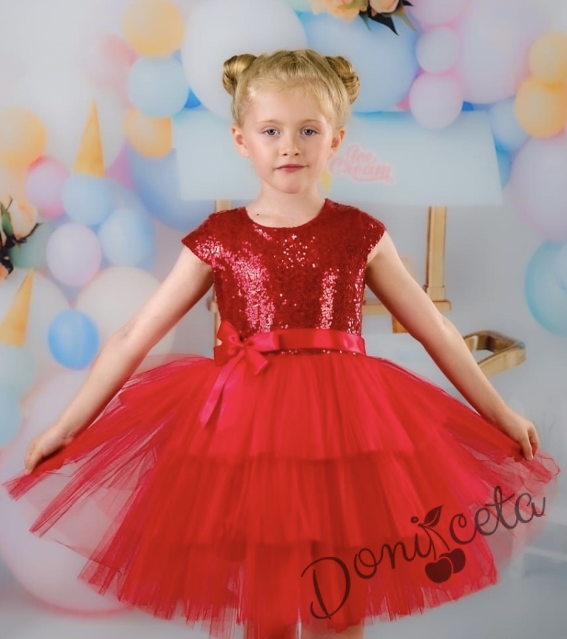 Официална коледна детска рокля Хава в червено с пайети и тюл на много пластове от колекция Червеника